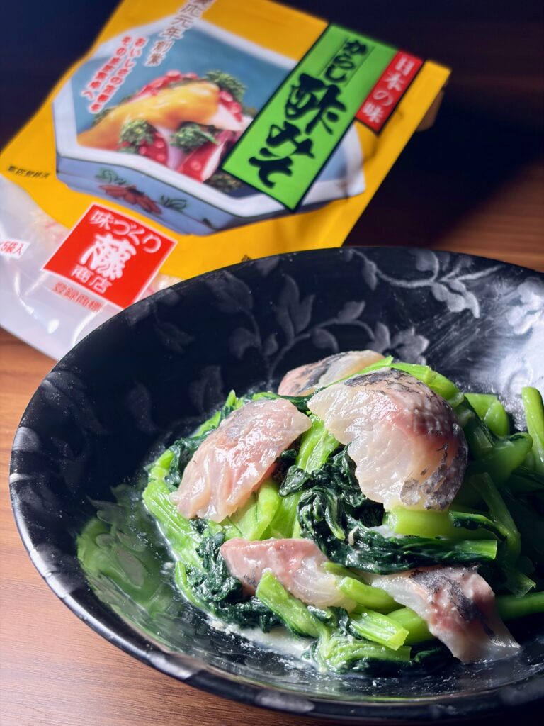 今が旬のアジと小松菜のからし酢みそ和え、お酒にも合う一品です。