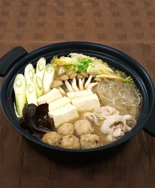 鍋に「藤商店 白麻辣湯風鍋スープ」を入れ、沸騰したら肉類、鶏つくねを入れて煮立てます。