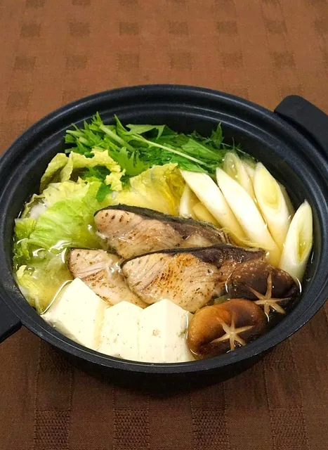 あごだしが効いた鍋つゆが、ぶりや野菜の美味しさを引き立てます。